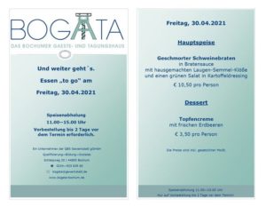 11:00: BOGATAs Mittagstisch "to go" Mai11:00: BOGATAs Mittagstisch "to go" Mai – 14.05.21 Westfälischer Linseneintopf mit Eisbeinfleisch und Mettwursteinlage 8,50€ 21.05.21 Hausgemachte Weißkohlroulade mit gemischtem Hackfleisch dazu Zwiebelbratensauce und Butterkartoffeln mit frischen Kräutern 9,50€ 28.05.21 Tagliatelle mit Lachs, Weißweinsauce und grünem Spargel 14,50€ Nur mit Vorbestellungen bis zu 2 Tagen vor dem Termin beim Bogata-Team